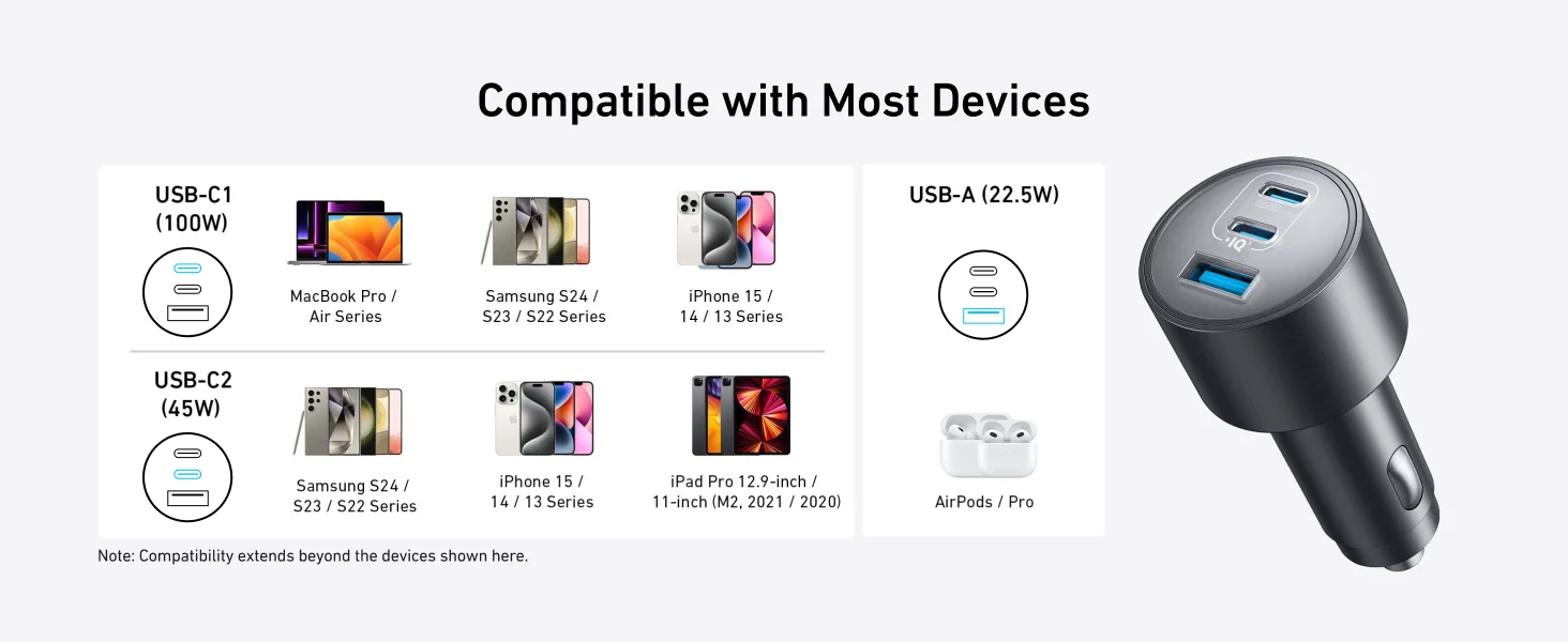 Meanwhile, the 45W USB-C2 port provides fast and reliable charging for smartphones and other devices. It is compatible with many popular phones, including iPhones and Samsung devices, ensuring stable and efficient power delivery. This means you can keep your phone charged for navigation, communication, and entertainment throughout your journey.